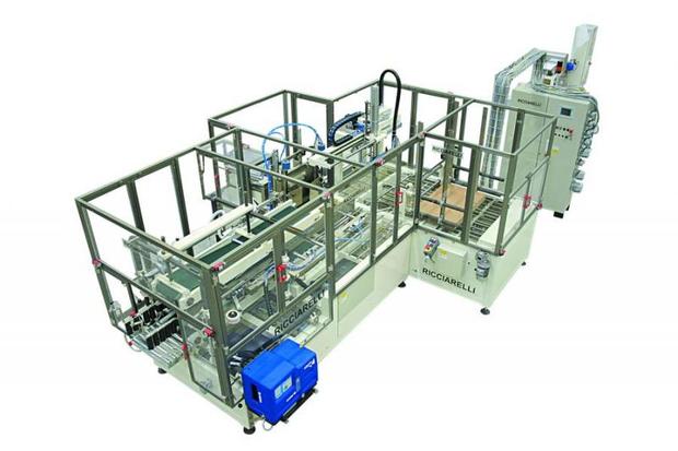 Automatic casepacker for packing cartons into pre-glued cardboard RSC; cartons are pushed end-first into cases by pushers. Casepacker complete with hot-melt gluer or/ and taper at outfeed.