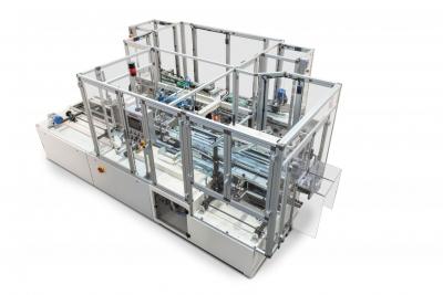 Automatic casepacker for packing bags of long goods into pre-glued cardboard RSC; bags are pushed end-first into cases by pushers. Casepacker complete with double inlet, hot melt gluer or/and taper at outfeed.
