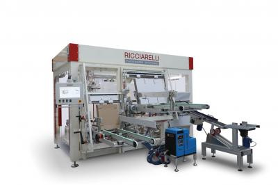 Encartonadora automática para paquetes y estuches, con inserción de pie, en cajas de cartón "wraparound" compuesta por bandeja expositora y tapa.