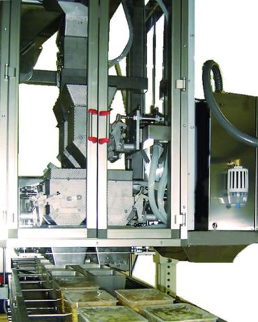 Dispositif pour la réunion des pesées en provenance de la peseuse associative et le remplissage des barquettes.