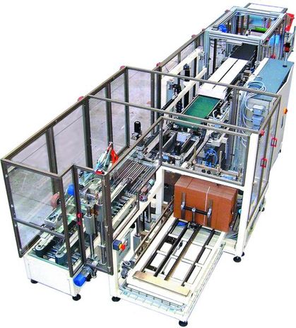 Encaisseuse automatique pour sachets, avec introduction des sachets couchés ou debout (carton exposant à double fond carré DFQ et fond carré FQ) en cartons pré-encollés de type américain (RSC) avec ou sans rabats supérieurs, encolleur et/ou enrubanneuse à la sortie. Vitesse maximale en entrée: 110 sachets à la minute en position couchée 90 sachets à la minute en position verticale