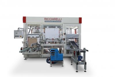 Encaisseuse automatique pour sachets et étuis, introduits debout dans des cartons “wraparound” composés d’un plateau présentoir et d’un couvercle.