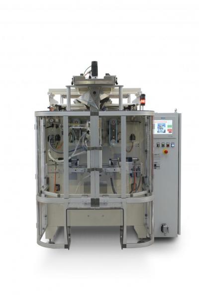 Conditionneuse verticale continue form-fill-seal mod. VS150 à grande vitesse en sachets formés par une bobine de film accouplé et polyéthylène, disponible en version standard, inclinée et en acier inoxydable.