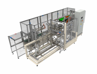 Incartonatrice automatica per sacchetti con inserimento coricato in scatole di cartone preincollato tipo americano (RSC), movimentate da manipolatore robotizzato, incollatore e/o nastratrice in uscita.